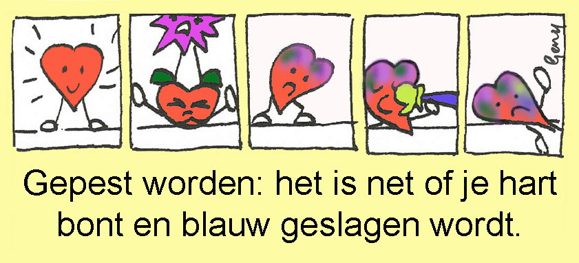 Als kind ben ik jarenlang gepest, getreiterd en vernederd. Ik wilde dolgraag bij de groep horen en vrienden hebben. Ik deed van alles om er bij te horen. Dit werd alleen maar grappig gevonden en ik werd totaal niet serieus genomen. Ik voelde me op een gegeven moment ook niets meer waard, werd onzeker en ging het zelf geloven, dat ik weinig voorstelde. Waarom zouden ze naar mij luisteren, wanneer ik iets vertelde? Wanneer ik toen had geweten hoe ik mijn grenzen kon aangeven, een beter zelfbeeld had en sociaal weerbaarder was geweest, dan was mijn schooltijd heel anders verlopen!