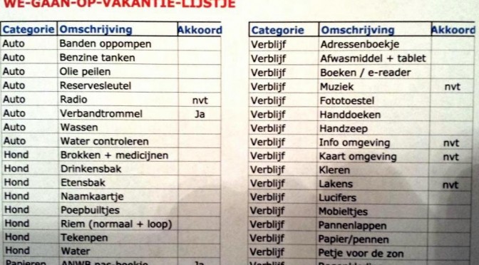 Het overzichtje dat ik gemiddeld twee keer per jaar uitprint, heet ‘Het-we-gaan-op-vakantie-lijstje’.