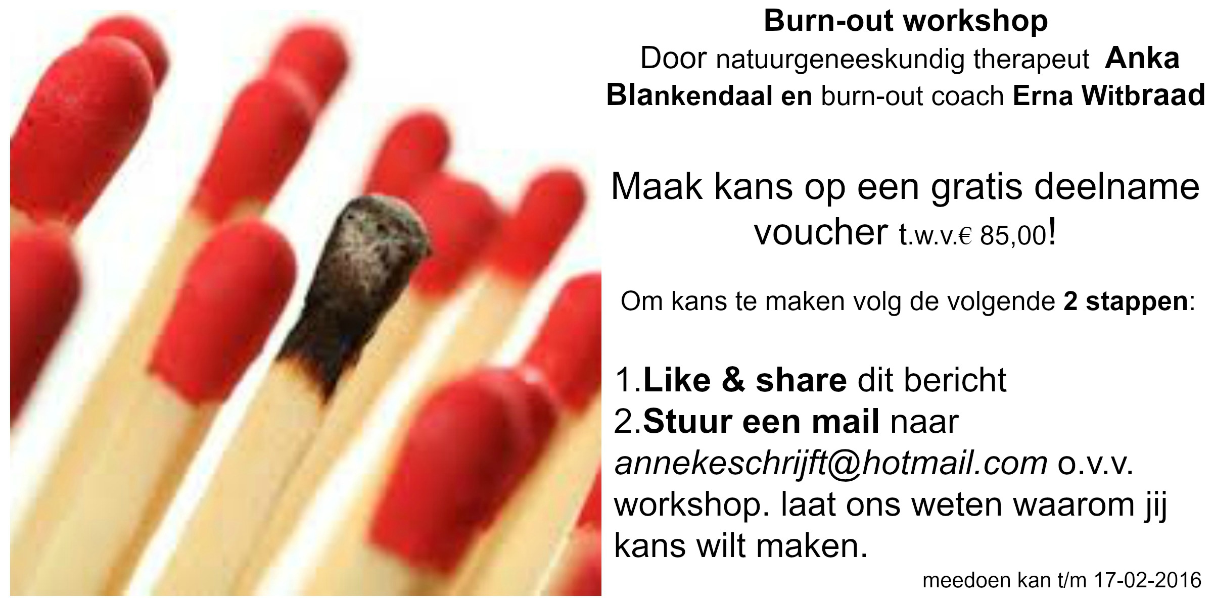 Een burn-out is een uitgelezen kans om je leven onder de loep te nemen. Waar sta je op dit moment en waar wil je naar toe? Door op een positieve manier te onderzoeken waar voor jou de belangrijkste oorzaken liggen voor je burn-out kun je je klachten gebruiken om je leven anders in te richten. Anka en erna gaan jou zelf weer aan het roer zetten door middel van gerichte oefeningen en opdrachten. Want jij weet het beste wat je nodig hebt om beter te worden. Aan het eind van de workshop ontstaat aan de hand van deze opdrachten een door jouw zelf geschreven stappenplan waarmee je de komende tijd aan de slag kunt gaan om weer in balans te komen!