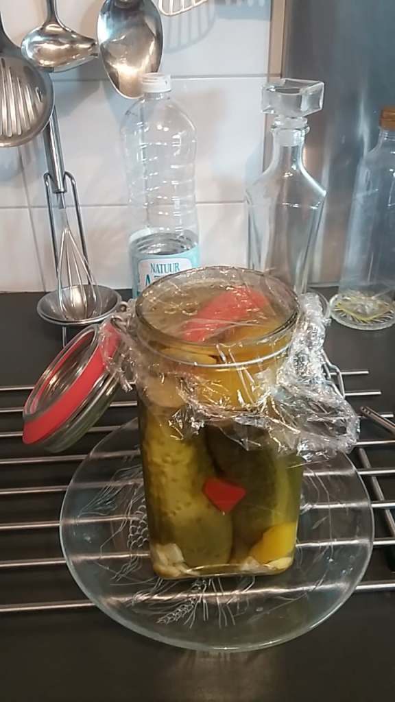 6. Eventueel kun je wat zwaars op de komkommers leggen (bijvoorbeeld een bord) om te                   zorgen dat de komkommers in het geheel onder water blijven. Anders heb je kans dat de             komkommers aan de onderkant zacht worden en aan de bovenkant hard blijven. Sluit de             pan af  met de deksel en laat het zo’n 2 tot 3 uur afkoelen.