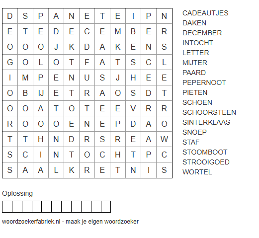 Sinterklaas woordzoeker Gepost op november 20, 2024 door Anneke Schrijft De geur van pepernoten, warme chocolademelk en het heerlijke avondje in zicht. Wat past daar beter bij dan een gezellige woordzoeker? Print de puzzel uit en zoek alle woorden rond Sinterklaas, van intocht tot tot schoen. Veel puzzelplezier! Dit delen:Tweet Klik om af te drukken (Opent in een nieuw venster) Print Klik om dit te e-mailen naar een vriend (Opent in een nieuw venster) E-mail Klik om te delen op WhatsApp (Opent in een nieuw venster) WhatsApp Vind-ik-leuk Aan het laden... Gerelateerd Gepubliceerd door Anneke Schrijft Bekijk alle berichten van Anneke Schrijft
