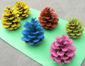 - Maak een mobile door twee dunne latjes gekruist op elkaar te lijmen en in de uiteinden een gaatje te maken. Doe daar visdraad door (of wol) en hang er (geverfde) schelpen aan . Maak bovenin het midden ook een gaatje zodat je daar een draadje door kan doen waar je de mobile aan op kan hangen.